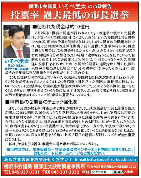 本日発行のタウンニュース保土ケ谷区版に市政報告を掲載しました。
