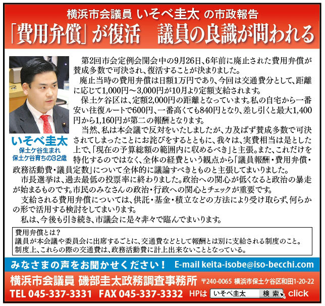 本日発行のタウンニュース保土ケ谷区版に市政報告を掲載しました。