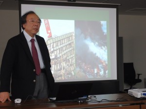 東日本大震災は、我が国の中でも比較的人口が少ない地域で起こったが、阪神・淡路大震災は、人口密集地で起こった。このような都市災害は、関東大震災以来なかったのではないかという話しから始まり、学部を設置した目的や危機管理についての教授の考えをお聞きしました。